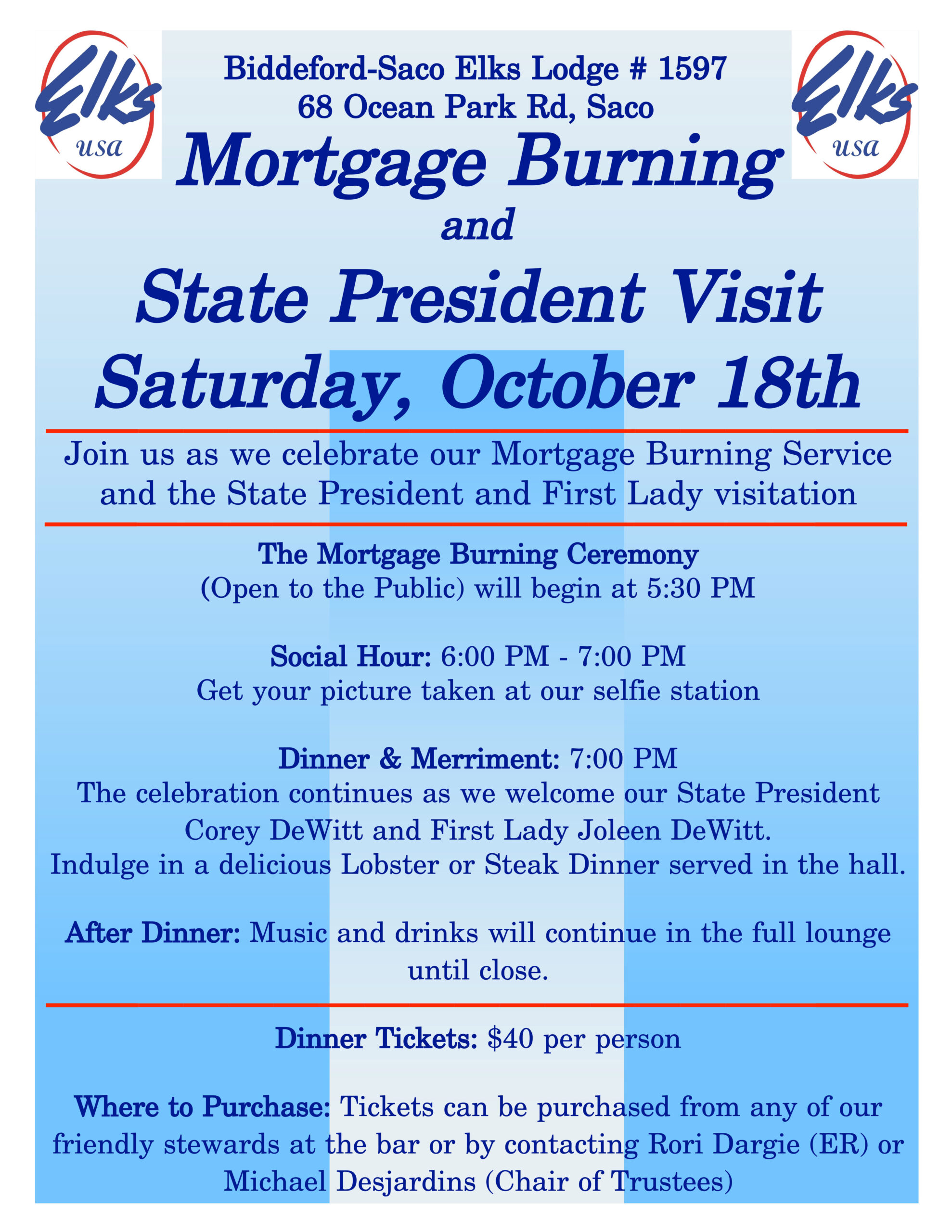 October 18, 2025 | Biddeford-Saco Elks | Visitation & Mortgage Burning Celebration |